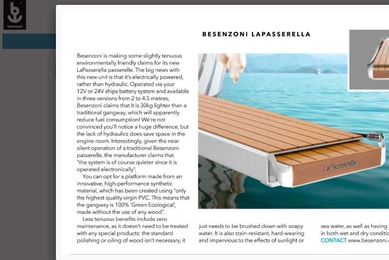 Besenzoni is making some slightly tenuous environmentally friendly claims for its new LaPasserella passerelle. The big news with this new unit is that it’s electrically powered, rather than hydraulic. Operated via your 12V or 24V ships ...