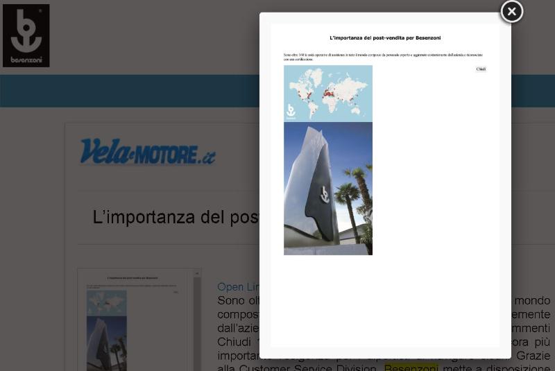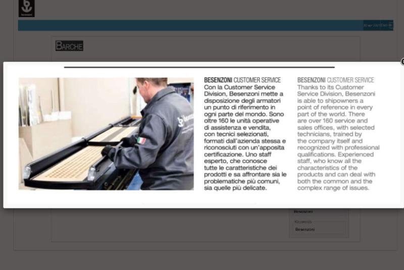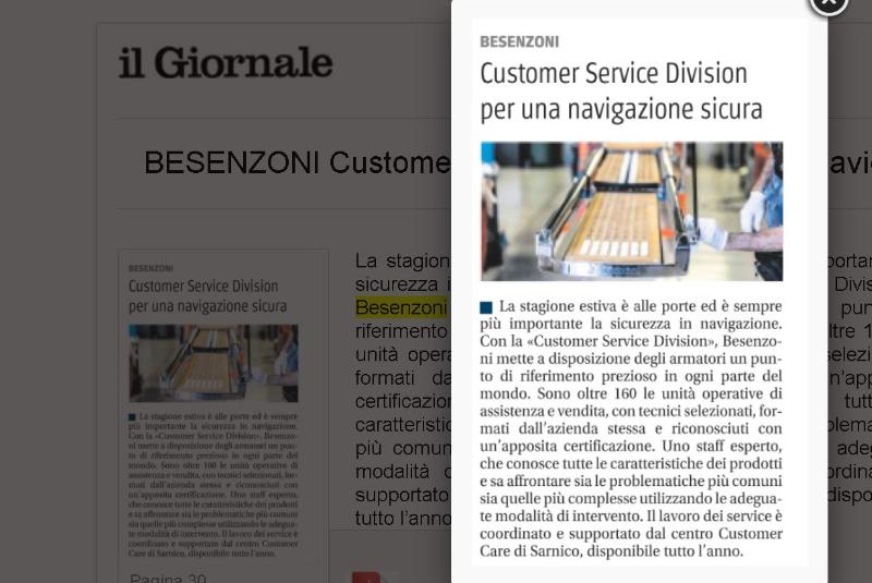 BESENZONI CUSTOMER SERVICE Con la Customer Service Division, Besenzoni mette a disposizione degli armatori un punto di riferimento in ogni parte del mondo. Sono oltre 160 le unità operative di assistenza e vendita, con tecnici ...