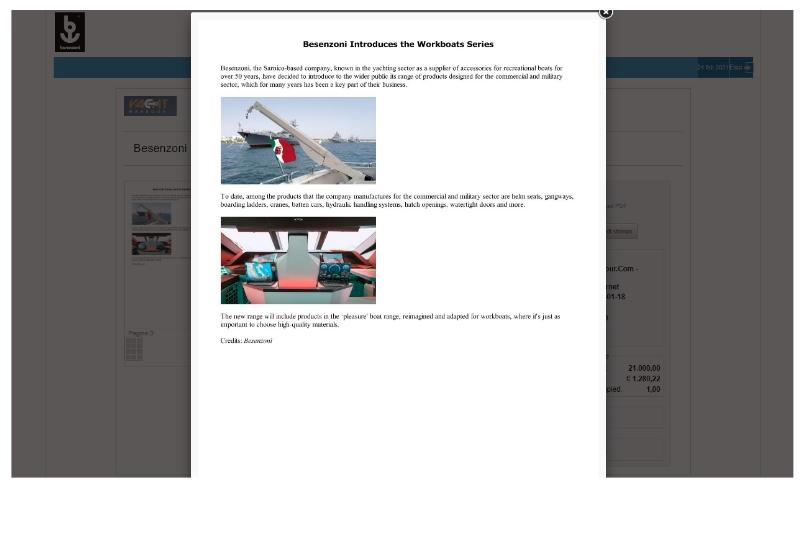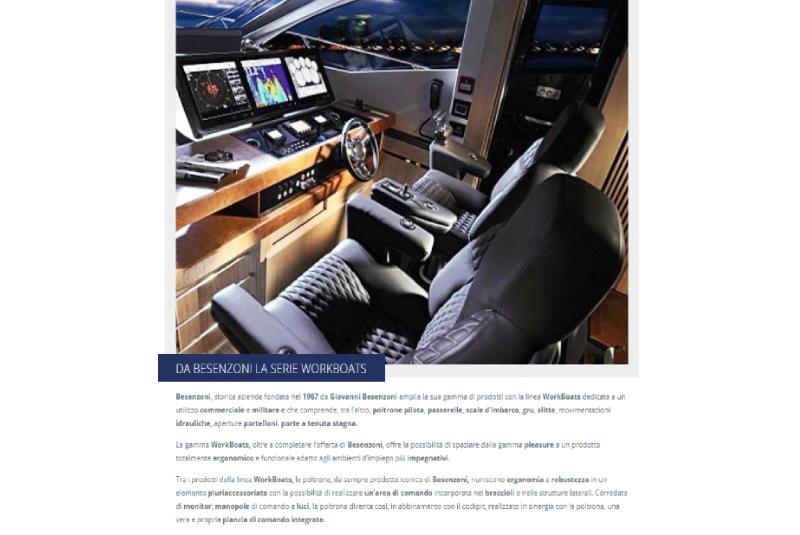 Besenzoni, storica azienda fondata nel 1967 da Giovanni Besenzoni amplia la sua gamma di prodotti con la linea WorkBoats dedicata a un utilizzo commerciale e militare e che comprende, tra l’altro, poltrone pilota, passerelle, scale ...