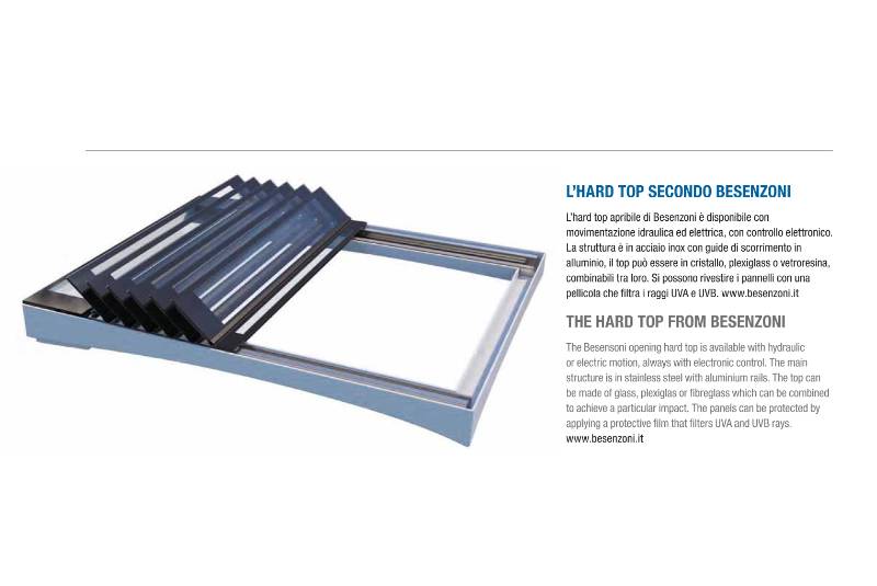 L'Hard-Top secondo Besenzoni L’Hard-Top apribile di Besenzoni è disponibile con movimentazione idraulica ed elettrica, con controllo elettronico. La struttura è in acciaio inox con guide di scorrimento in alluminio, il top può essere in ...