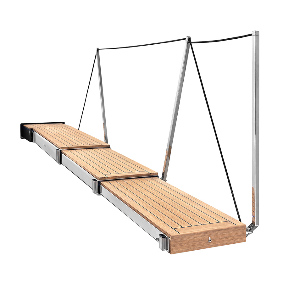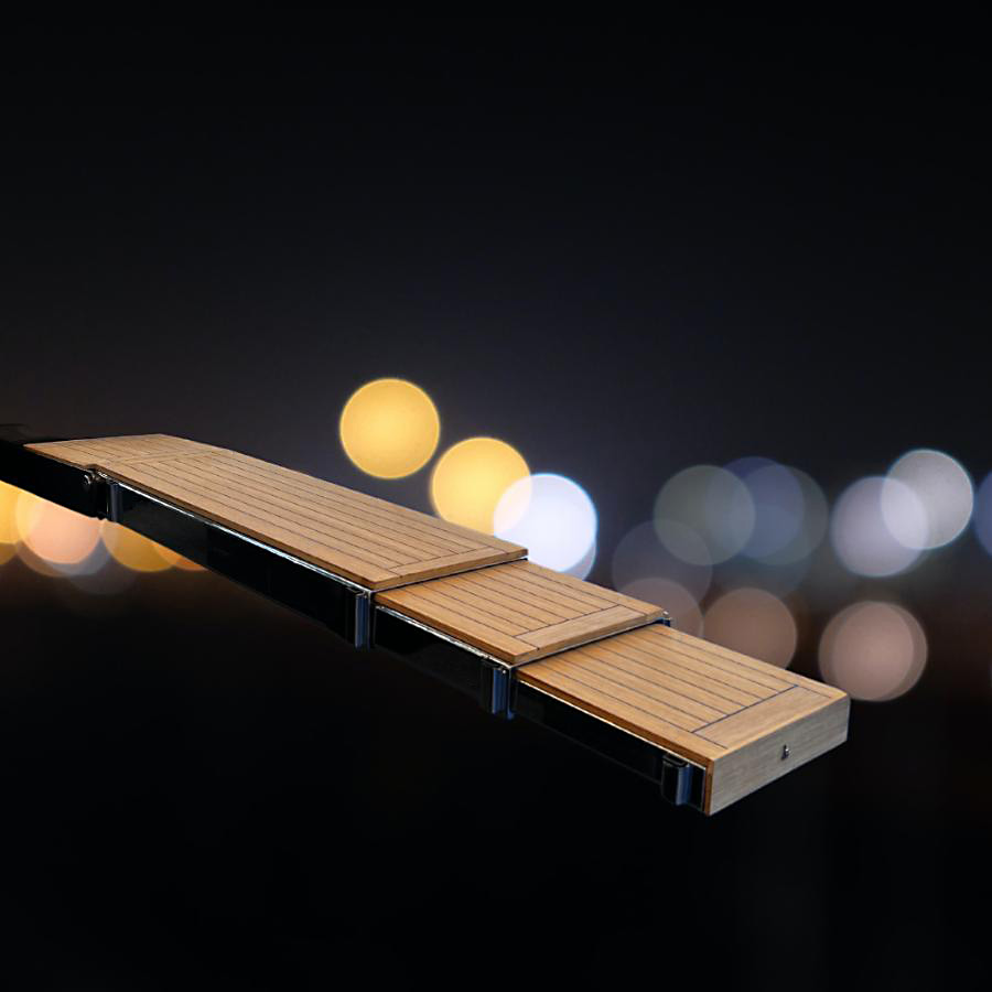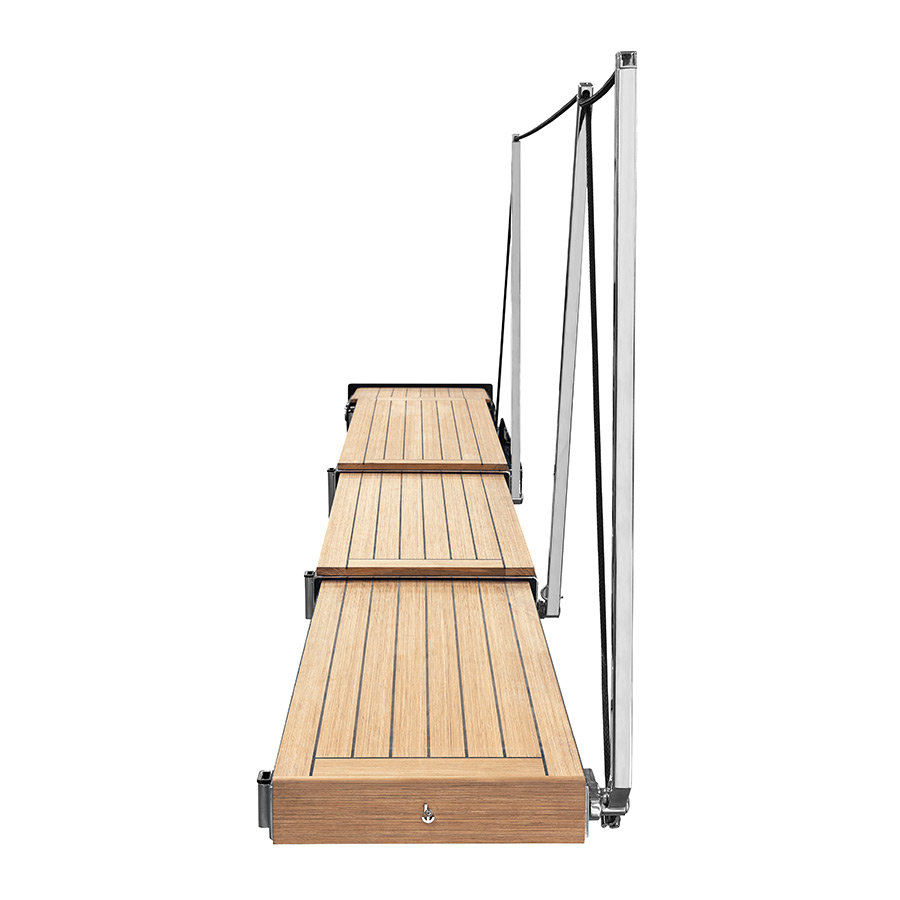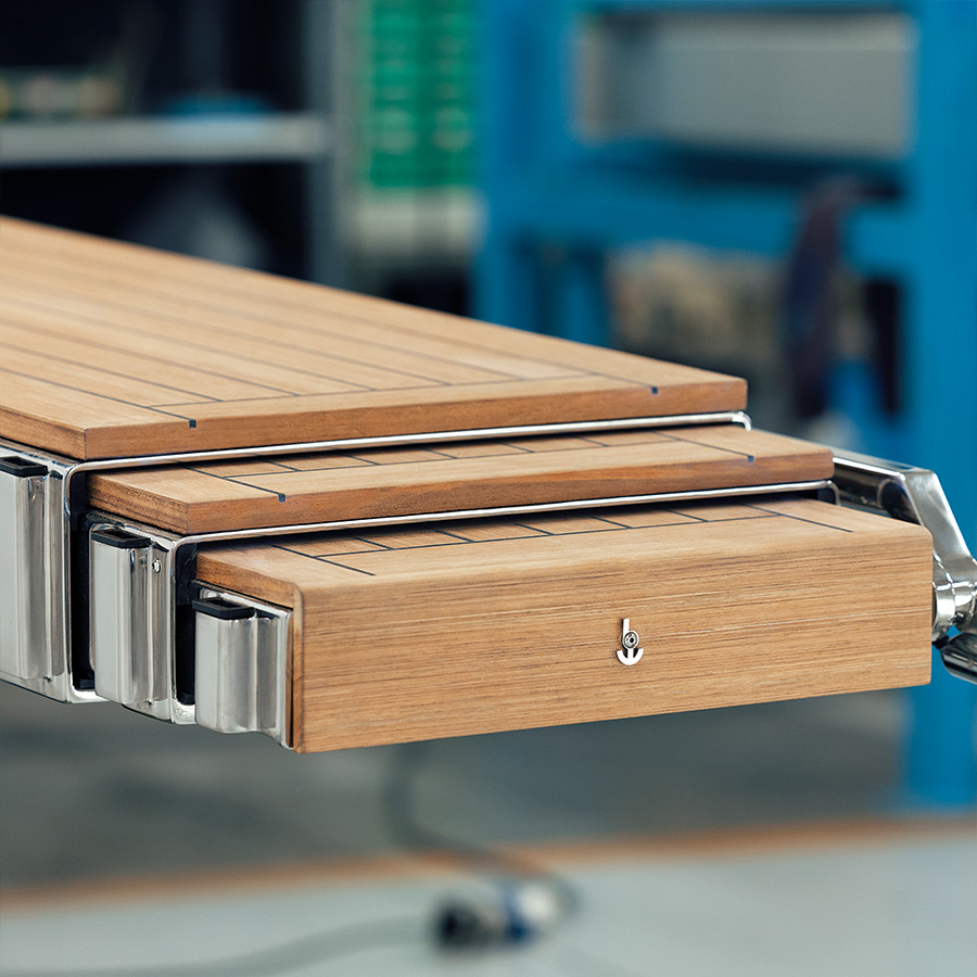 • Pedana di camminamento in teak gommato nero e luci di cortesia su ogni inizio sezione del camminamento