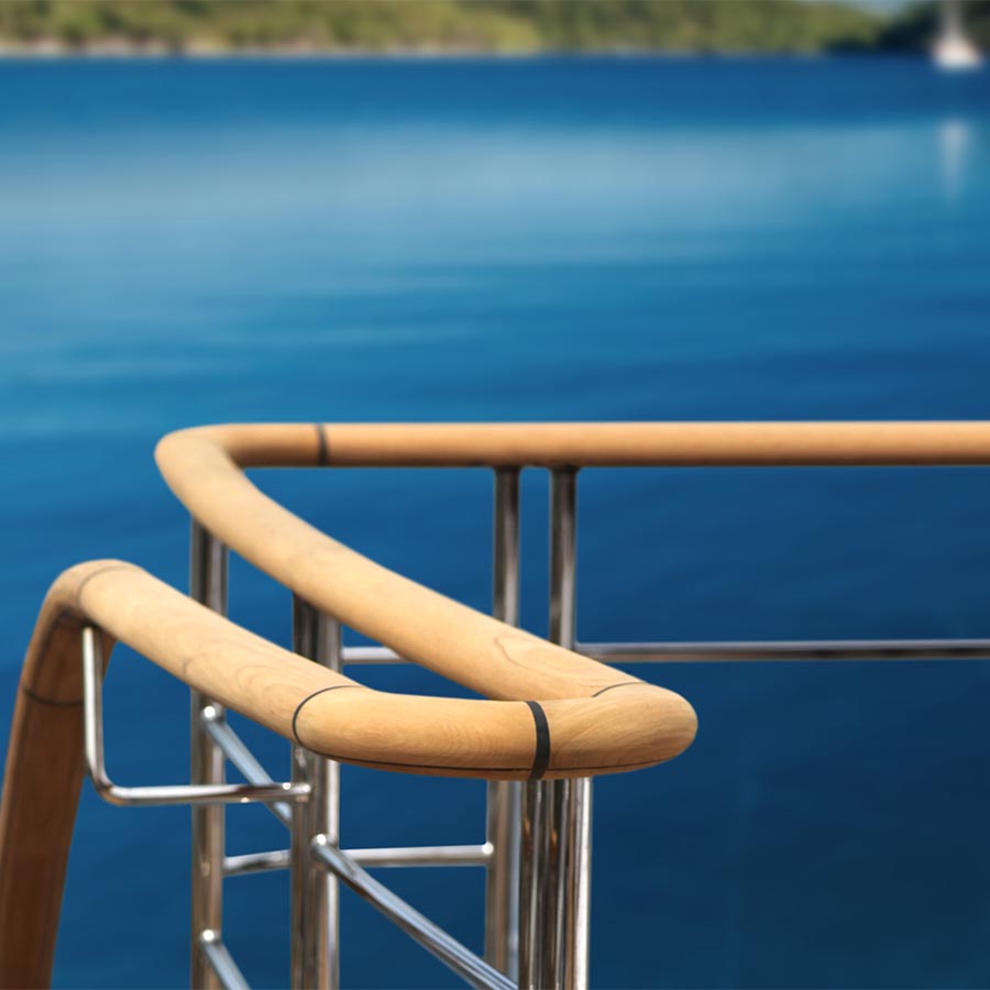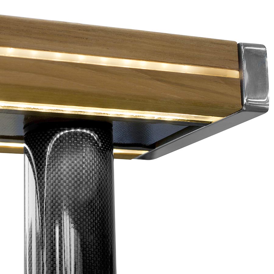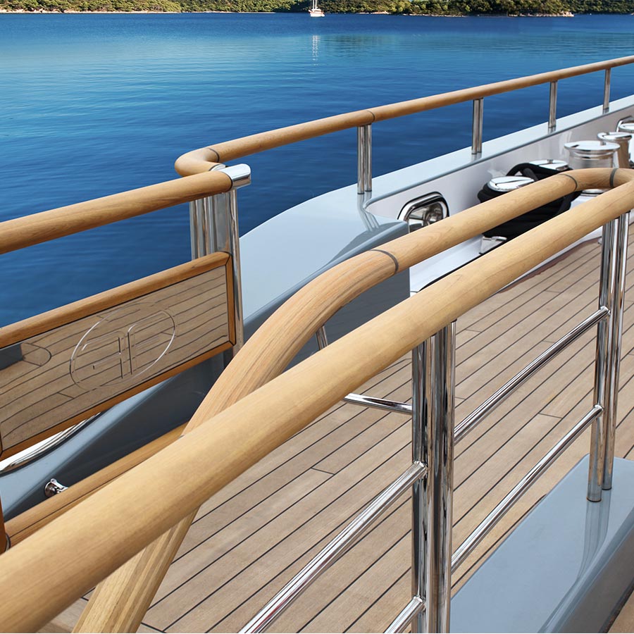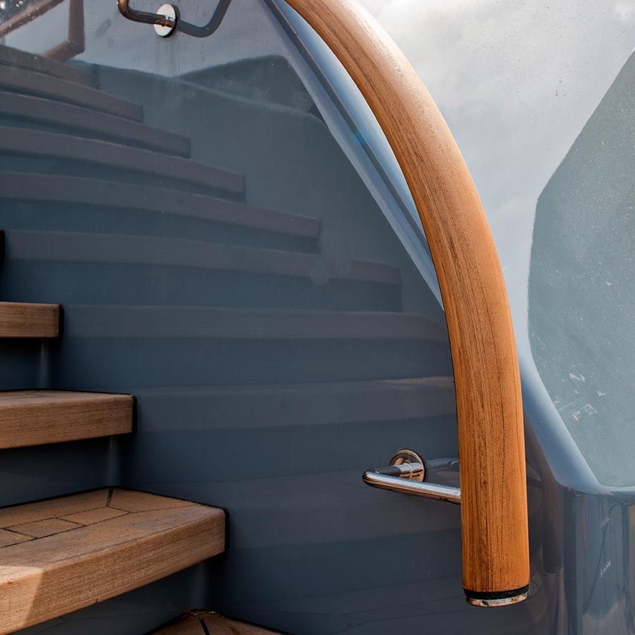 Il pulpito è un articolo custom che segue fedelmente tutte le linee della barca, gli sbalzi di altezze fra prua, poppa, scale, pozzetto. Il tutto realizzato con la profonda ricerca nei materiali: una dosata combinazione di carbonio, teak, inox e luci led per coniugare solidità, piacevolezza del legno e visibilità della presa anche di notte.